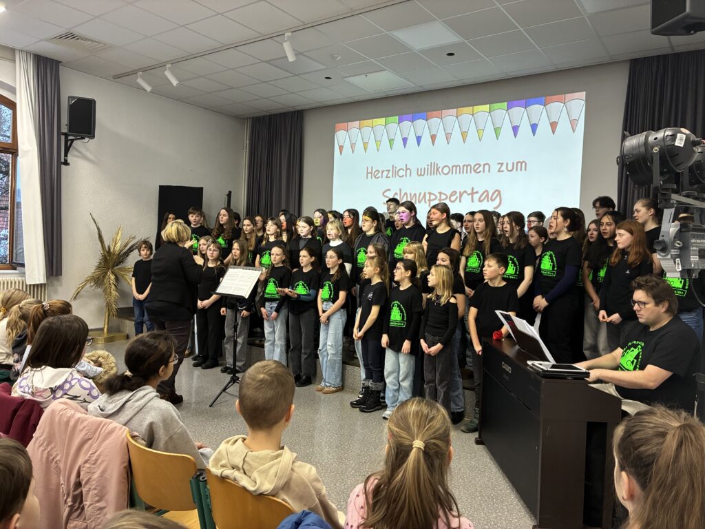 Am heutigen Schnuppertag durften wir rund 160 neugierige Schülerinnen und Schüler am PMG begrüßen, die unsere Schule kennenlernen wollten. Schon der Auftakt zeigte, wie vielfältig und lebendig unser Schulleben ist: Der Chor sorgte für eine stimmungsvolle musikalische Begrüßung, während der DG-Kurs der 9. Klasse mit einem kreativen Beitrag beeindruckte.